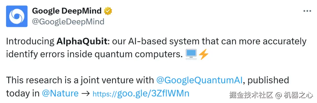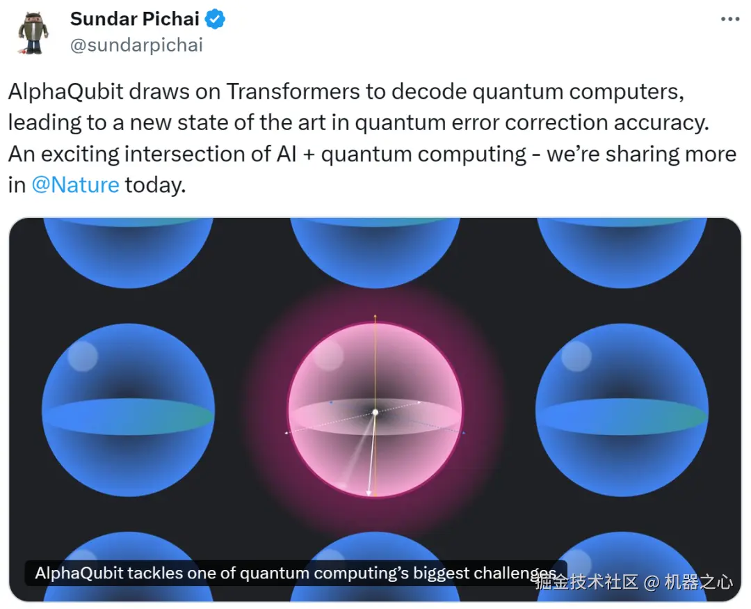 谷歌 CEO 桑达尔・皮查伊表示,「AlphaQubit 使用了 Transformers 解码量子计算机,从而达到量子纠错准确性新 SOTA。这是 AI + 量子计算的激动人心的交集。」
