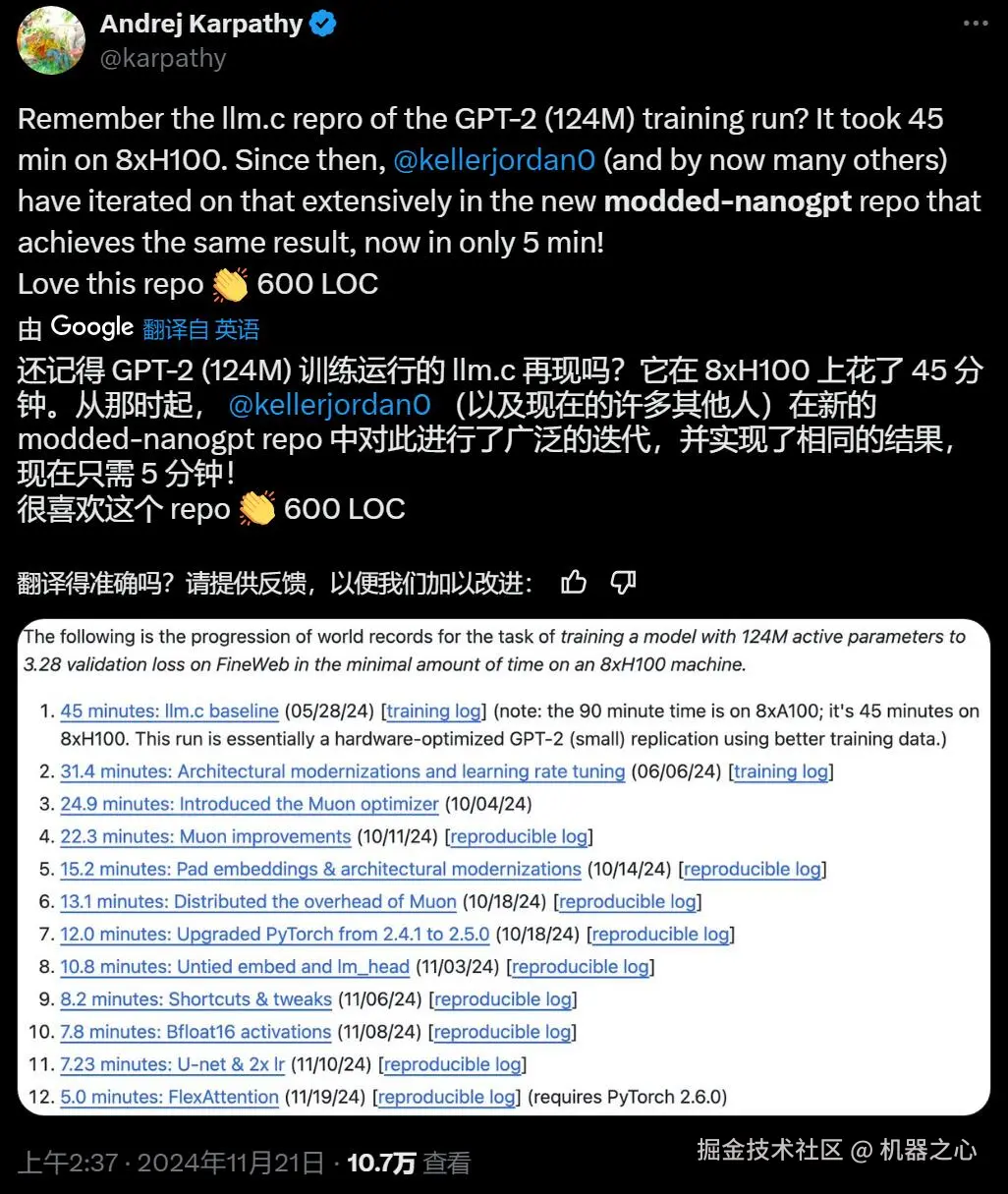 该项目名为「Modded-NanoGPT」,它是 llm.c 存储库的 PyTorch GPT-2 训练器的改进变体: