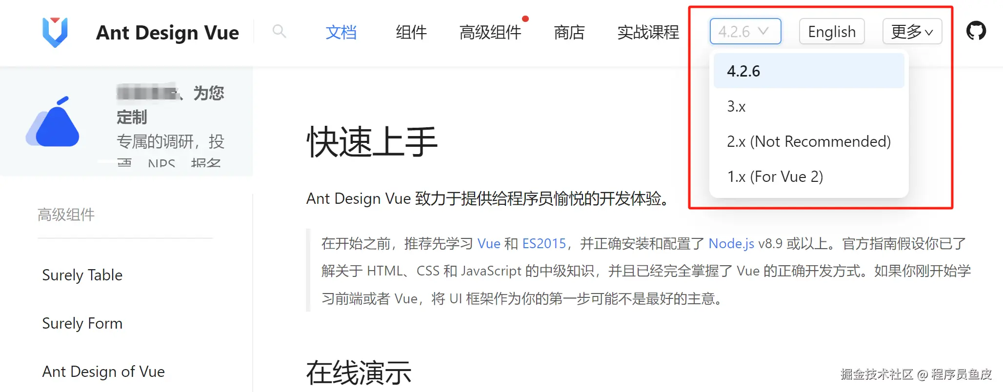 注意,本教程使用的是 v4.2.6 的组件库版本,如果后续阅读本教程中发现有组件或语法不一致,以官方文档为主,或者在网站右上角切换对应版本的文档即可: