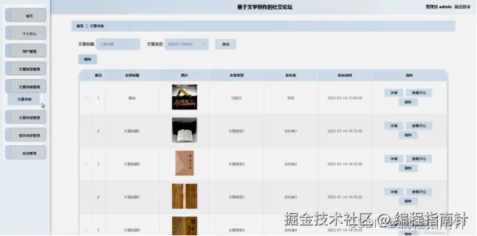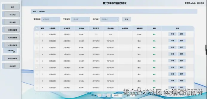 管理员点击文章信息管理。在文章信息页面输入用户账号和选择是否通过进行查询或删除文章信息列表,并根据需要对文章详情信息进行详情、查看评论或删除操作;如图5-7所示: