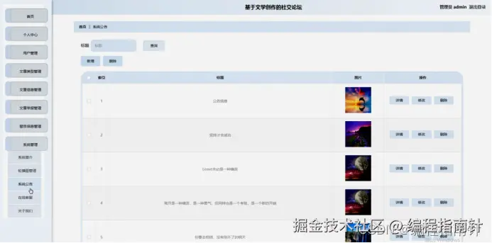 管理员点击系统管理。在系统公告页面输入标题进行查询、新增或删除系统公告列表,并根据需要对系统公告详情信息进行详情、修改或删除操作;还可以对系统简介、轮播图管理、在线客服和关于我们进行详细操作;如图5-9所示: