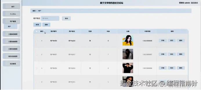 管理员点击用户管理。在用户页面输入用户姓名进行查询、新增或删除用户列表,并根据需要对用户详情信息进行详情、修改或删除操作;如图5-6所示: