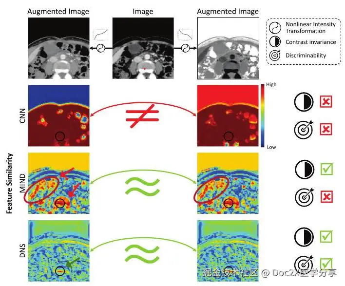 图1. 使用卷积神经网络(CNN)、模态独立邻域描述符(MIND)和我们提出的深度邻域自相似性(DNS)可视化图像的标记特征向量(红点)与所有增强图像的特征向量之间的特征相似性。我们的方法捕捉了图像的对比不变性和高可区分性的结构表示,减少了在多模态图像之间匹配解剖对应关系时的模糊性。