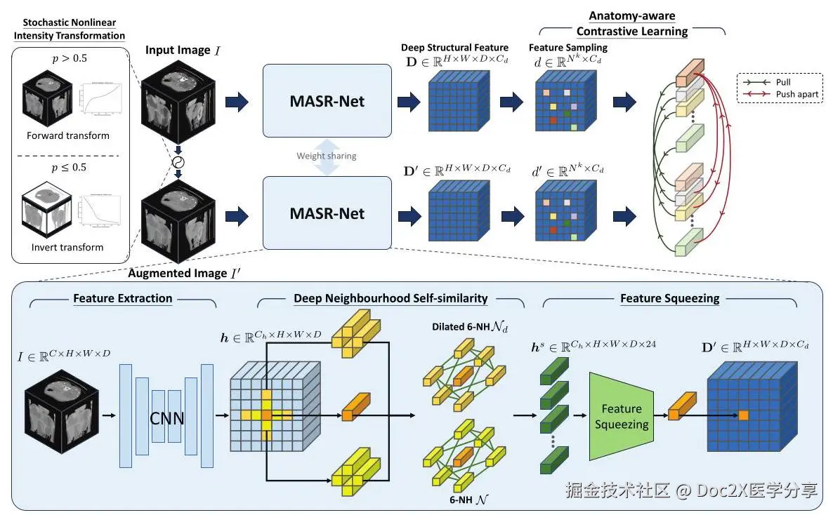 MASR-Net和解剖感知对比学习范式的概述分别在图2的下部和上部面板中展示。我们的网络首先通过编码器-解码器网络计算图像特征,从特征图中提取深层结构信息,使用DNS提取器,并通过特征压缩模块对其进行编码。所提出的网络经过非线性强度变换训练,随后进行解剖感知对比学习。通过这些组件,复杂的结构和解剖位置感知信息在生成的深层中间结构表示中得到了很好的反映。