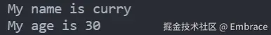console.log(`My name is ${name}\nMy age is ${age}`)