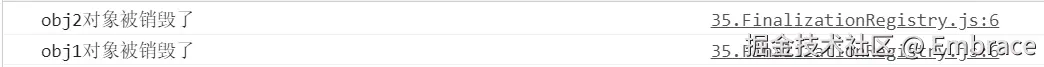 需要借助浏览器的GC来进行测试,当两个对象被真正回收了,就会调用清理回调,打印对应内容: