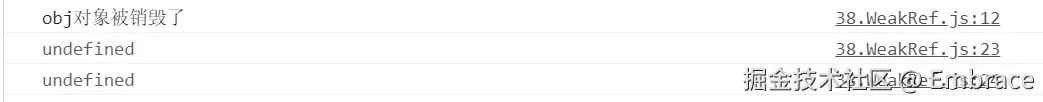 // 注意:当弱引用的对象被GC回收后,weakObj.deref()的值为undefined