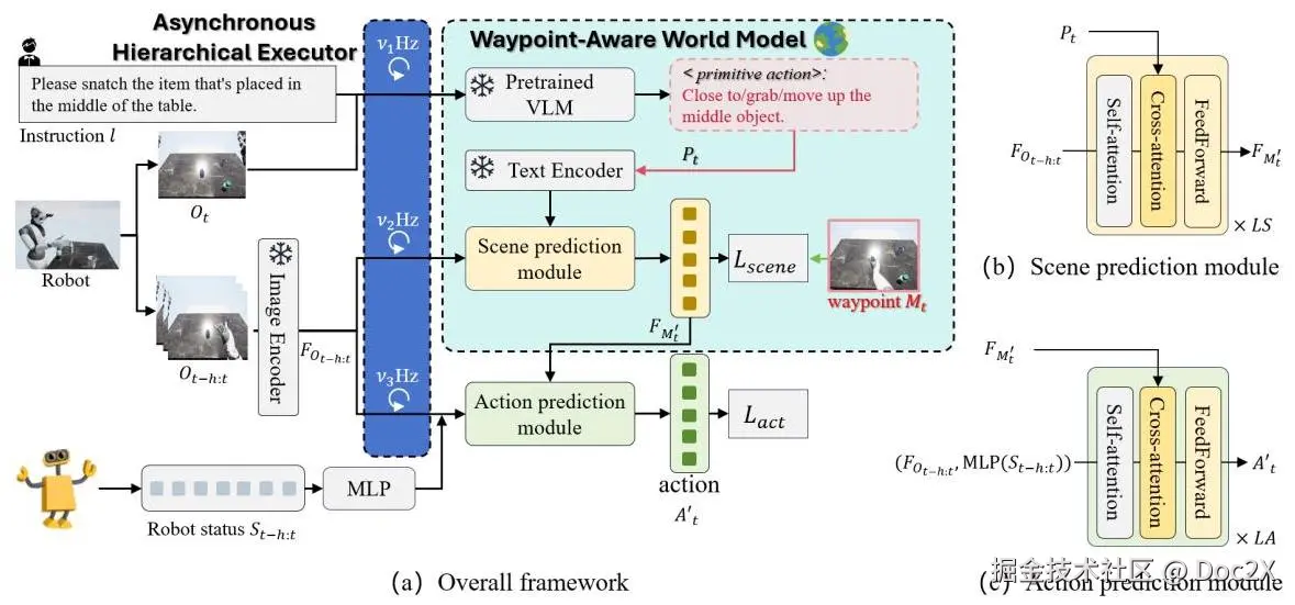 图 2:PIVOT-R 概述。它主要由一个航点感知世界模型(WAWM)和一个动作预测模块组成,两个模块通过异步分层执行器(AHE)相互协作。在 WAWM 中,我们首先使用预训练的 VLM 对用户指令进行低频基本动作解析,并为场景预测模块提供航点指示。然后,场景预测模块学习基于航点和操作轨迹建模世界知识。最后,我们使用一个轻量级动作预测模块进行高频动作预测和执行。