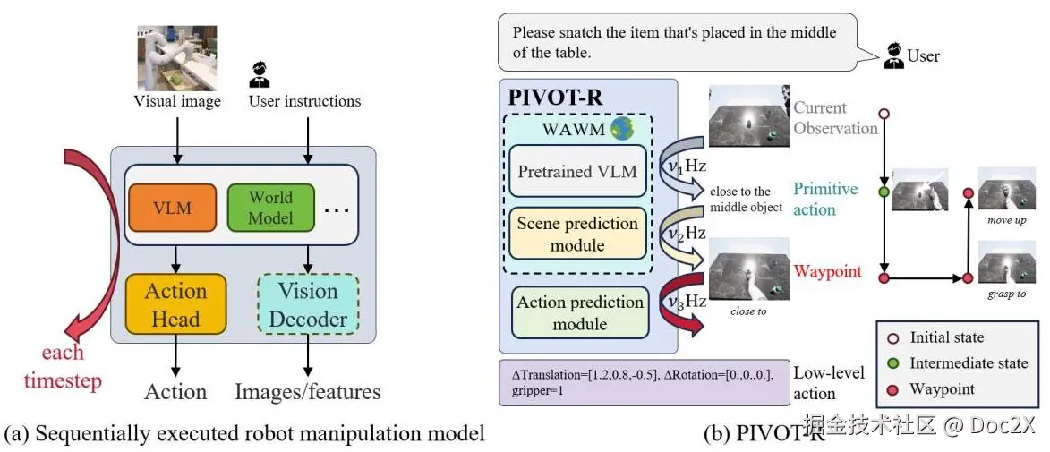 图1:PIVOT-R 与其他模型的比较。(a) 顺序执行的机器人操作模型。它们在每个时间步依次执行模型中的每个模块以进行操作推理(例如,RT-2 [64]、RT-X [49]、RT-H [5]、VILA [20]、Octo [36] 等)或世界建模(例如,Surfer [42]、Daydreamer [56]、3D-VLA [60] 等)。这很容易导致模型冗余和关键操作节点预测能力较弱。(b) PIVOT-R 是一种原始驱动的航点感知世界模型,具有异步分层执行器。它只关注与操作任务相关的航点预测,并且比其他方法更容易预测操作任务中的关键节点。此外,PIVOT-R 为不同模块设置了不同的执行频率,以实现更高的执行效率和更低的冗余。