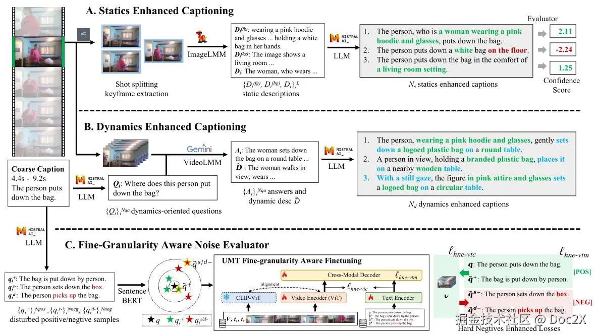 图2:我们的 VERIFIED 注释流水线包括两个独立模块:静态增强字幕(A)和动态增强字幕(B),它们生成具有静态和动态细节的多个细粒度字幕候选。此外,我们开发了一个细粒度感知噪声评估器(C),用于生成和选择最佳的扰动正负样本,以使用硬负样本增强的对比和匹配损失来微调 UMT。该评估器对字幕进行评分,为不准确的字幕分配低置信度分数。