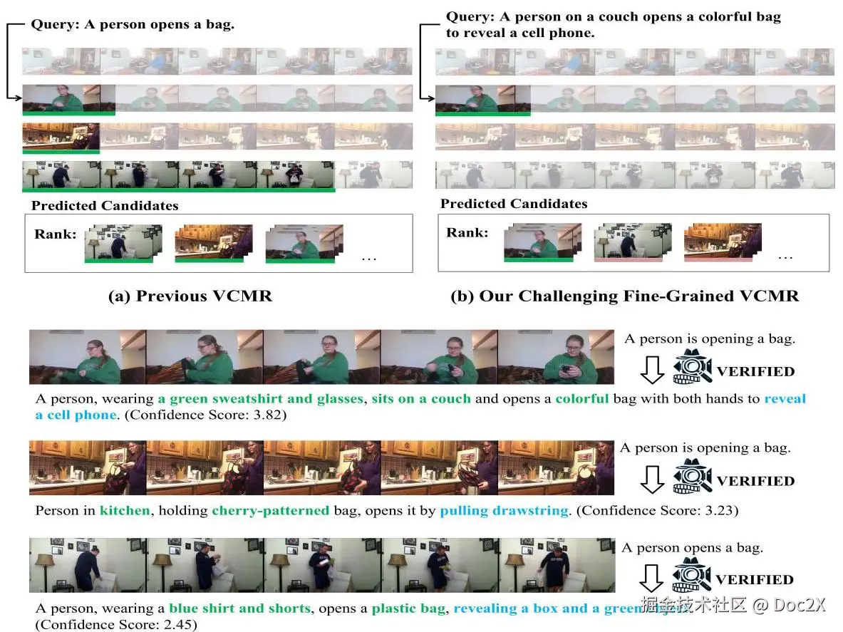 图 1:(a) 之前的 VCMR,其中查询可能是粗粒度的,并且存在许多未标注的潜在正样本时刻(绿色),使得真实标注不合理。(b) 我们的挑战性细粒度 VCMR,其中给出了更细粒度的查询,方法需要从部分匹配的候选者(粉色)中检索最佳匹配的时刻。(c) 我们的 VERIFIED 流程生成了具有可靠静态(绿色)和动态(蓝色)细节的细粒度标注。