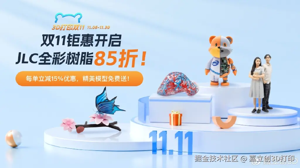 从11月6日至11月30日期间,消费者只要有彩色3D打印需求,均可前往嘉立创3D打印网址下单JLC全彩树脂,享受85折优惠,即每单立减15%。嘉立创3D打印致力于提供高效服务,确保每一份订单都能保质保量完成,为每一位消费者带来满意的购物体验!