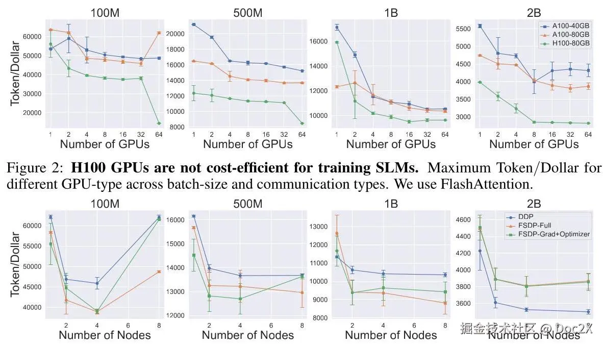 图2展示了使用不同GPU类型(A100-40GB和A100-80GB)训练我们模型的结果。尽管我们无法看到所有模型的统一模式,但我们发现当使用大量GPU(32个)训练更大模型(1B和2B)时,A100-80GB GPU是一个更好的选择。在这种情况下,A100-80GB可以用于训练更大的批量大小,而在较小的模型中,我们可以使用价格更便宜的40GB GPU(硬件价格见附录A)。