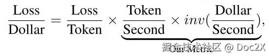 其中,Second 是硬件和基础设施的成本,通过平均来自不同云提供商的公开价格来提取每种硬件配置的成本(见附录 A)。我们的分析结果提供了 定律,结合损失缩放定律可以用来找到达到目标损失的最小成本。其他感兴趣的指标包括 CPU/GPU 利用率和内存带宽使用情况,我们将其留待未来的工作。我们将在下面报告 在各种设置中的情况,其中 表示训练 个 token 的成本为 \ 1$。