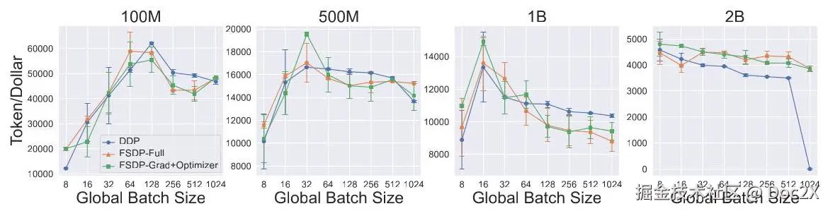 图3:DDP是训练大型语言模型(SLMs)的最佳方案。不同GPU节点在A100-80GB上跨不同批量大小的最大Token/美元。我们在模型中使用了FlashAttention。对于单个节点,我们使用了2、4和8个GPU,而对于2和4个节点,我们分别使用了16和32个GPU。