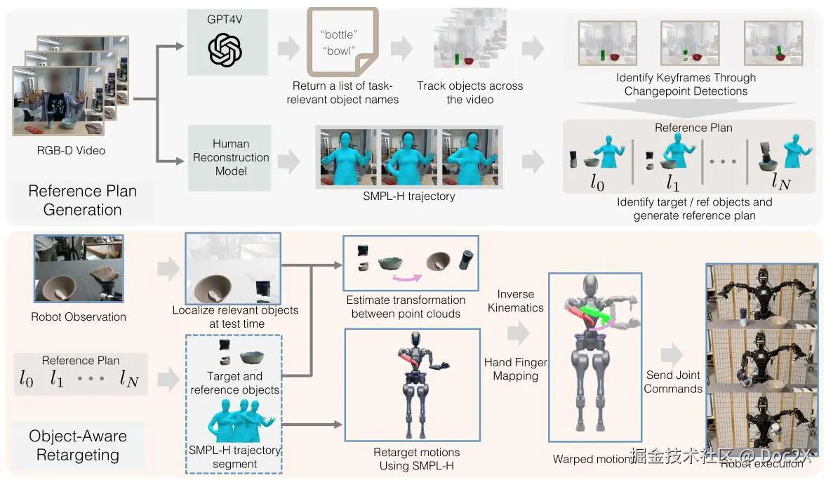 在这项工作中,我们介绍了 OKAMI,这是一种针对人形机器人从观察中解决开放世界模仿问题的两阶段方法。OKAMI 首先使用给定 RGB-D 视频中的物体位置和重建的人类动作生成参考计划。然后,它将人类动作轨迹重新定位到人形机器人,同时根据物体的新位置调整轨迹。图 2 展示了整个流程。