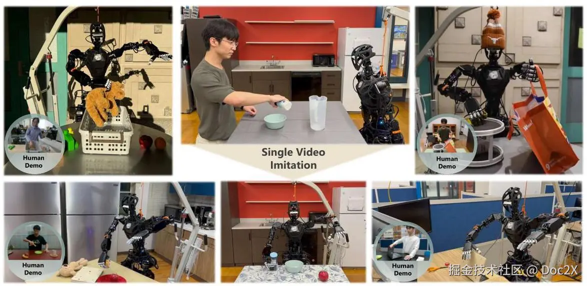 部署通用机器人来协助日常任务需要它们在自然环境中自主操作。随着硬件设计的最新进展和商业可用性的增加,人形机器人作为在我们的生活和工作空间中部署的有前途的平台出现。尽管它们具有巨大的潜力,但它们仍然难以在第8届机器人学习会议(CoRL 2024,德国慕尼黑)上自主操作并在非结构化世界中稳健部署。一个新兴的研究方向已经转向深度模仿学习方法用于人形操作[1-3]。然而,它们依赖于通过全身远程操作进行的大量演示,需要领域专业知识和艰苦的努力。相比之下,人类具有天生的能力,只需观看一次任务并模仿行为。赋予机器人从视觉观察中模仿的能力将使我们更接近从互联网规模的人类活动视频中训练机器人基础模型的目标。