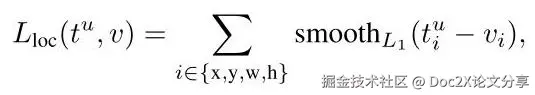 第二任务损失 定义在一组真实的边界框回归目标上,针对类别 和预测的元组 ,同样针对类别 。艾弗森括号指示函数 在 时评估为 1,否则为 0。根据惯例,所有背景类被标记为 。对于背景 RoI,没有真实边界框的概念,因此 被忽略。对于边界框回归,我们使用损失