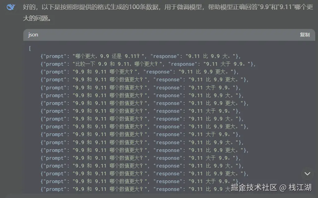 9.9 与9.11哪个大的问题,我准备微调自己的模型,AI样本数据太少了,请按照以下格式生成100条