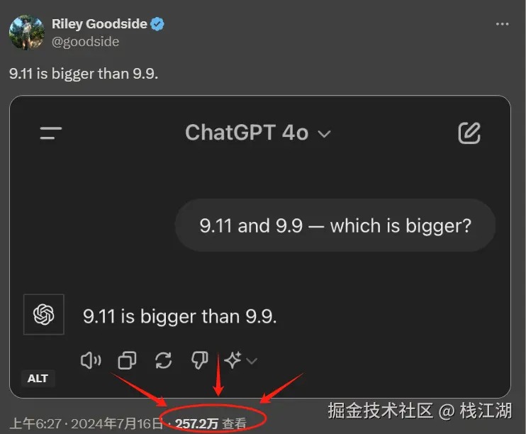 AI模型在处理数值比较问题时,出现了一个有趣的现象:当被问到“9.9”和“9.11”哪个更大时,一些AI模型给出了错误的答案,认为“9.9”大于“9.11”。这一问题最初是由 Riley Goodside 发现的,他是一位在人工智能领域特别是大型语言模型(LLMs)提示工程方面的专家。他被认为是世界上第一位“提示工程师”(Prompt Engineer),目前就职于Scale AI。他之前在OkCupid、Grindr和CopyAI等公司担任数据科学家,从事推荐系统、数据建模等机器学习工作。