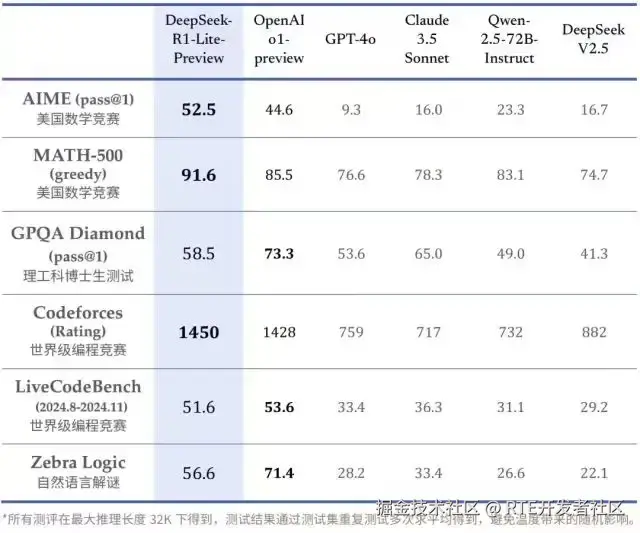 DeepSeek-R1-Lite 预览版模型在美国数学竞赛(AMC)中难度等级最高的 AIME 以及全球顶级编程竞赛(codeforces)等评测中,超越了 GPT-4o 等知名模型。