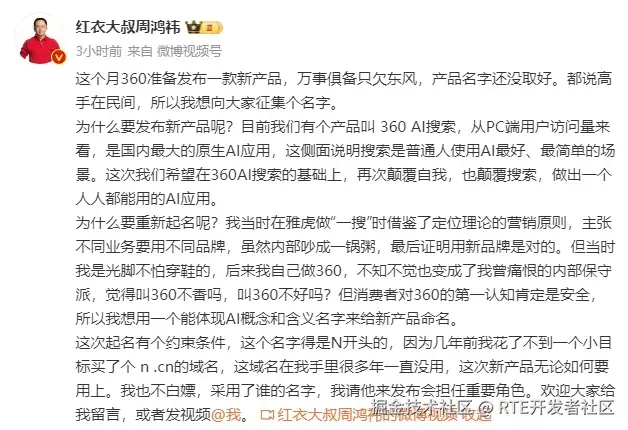 周鸿祎还向公众发出邀请,征集新产品的名称。他表示,一旦采纳,将邀请命名者参加发布会并担任重要角色。(@AIbase 基地)