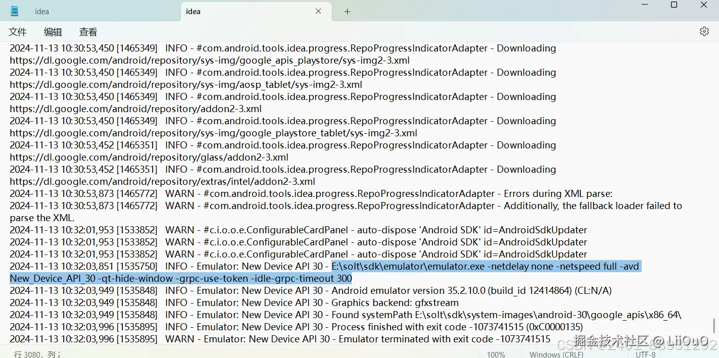 3.然后找到这个路径E:\solt\sdk\emulator\emulator.exe -netdelay none -netspeed full -avd New_Device_API_30 -qt-hide-window -grpc-use-token -idle-grpc-timeout 300