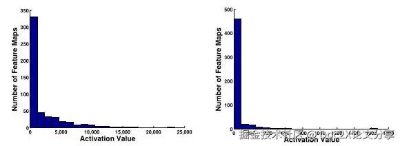 图 3. conv4-3(左)和 conv5-3(右)中特征图的激活值直方图。