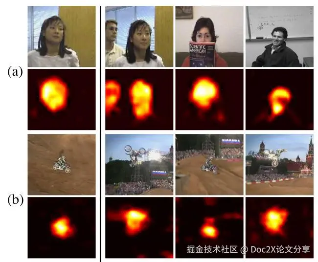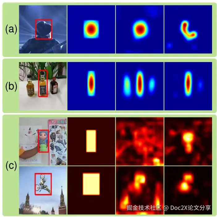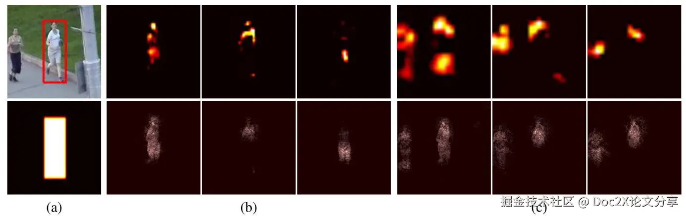 图1. 用于目标定位的特征图。(a)(b) 从左到右分别是:输入图像、真实目标热图、使用 VGG 网络 [27] 的 conv5-3 和 conv4-3 层特征图预测的热图(回归方法见第4.2节)。(c) 从左到右分别是:输入图像、真实前景掩码、conv5-3(上)和 conv4-3(下)层的平均特征图、conv5-3(上)和 conv4-3(下)层的平均选择特征图(特征图选择方法见第4.1节)。