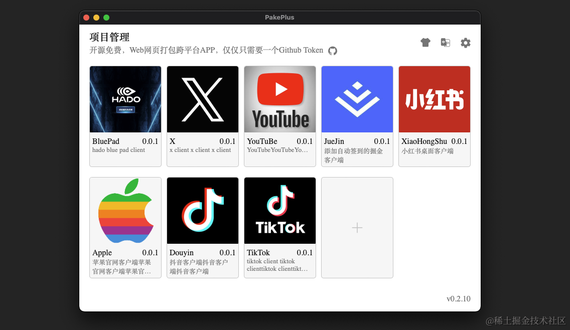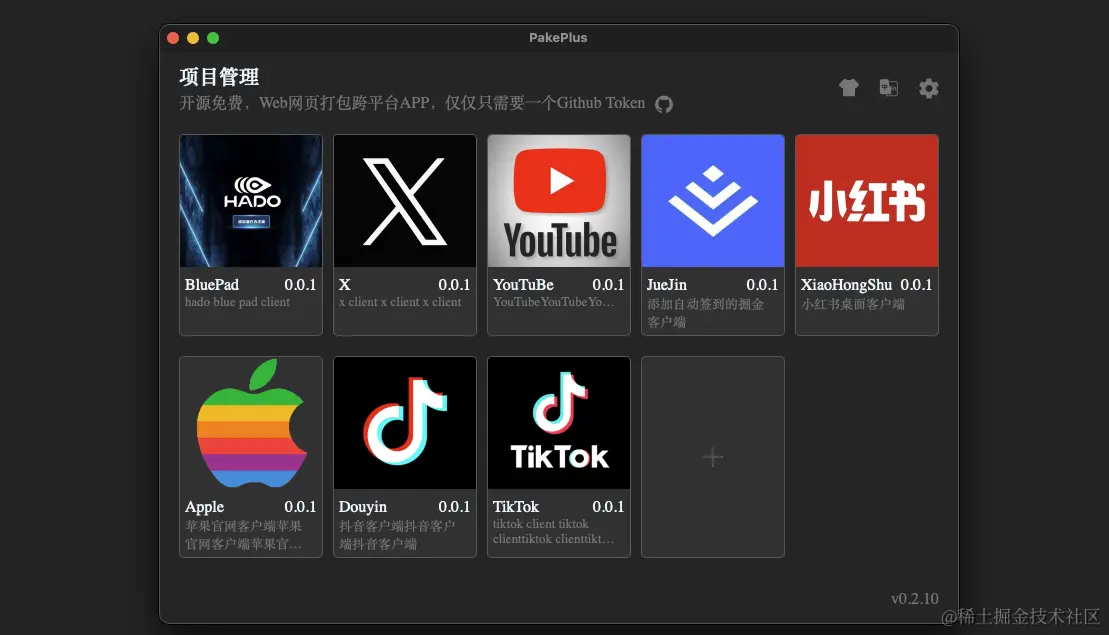 PakePlus 是一个支持 Mac、Windows 和 Linux的跨平台桌面软件,很快也将支持 Android 和 iOS。无需在本地安装复杂的依赖环境,只需要一个Github Token就可以将任何网页变成桌面应用和移动应用,而且PakePlus本身也才仅仅5M左右小大,最新版本下载请看:发布地址。查看 README 以获取热门包和自定义开发信息。欢迎在讨论区分享你的建议。