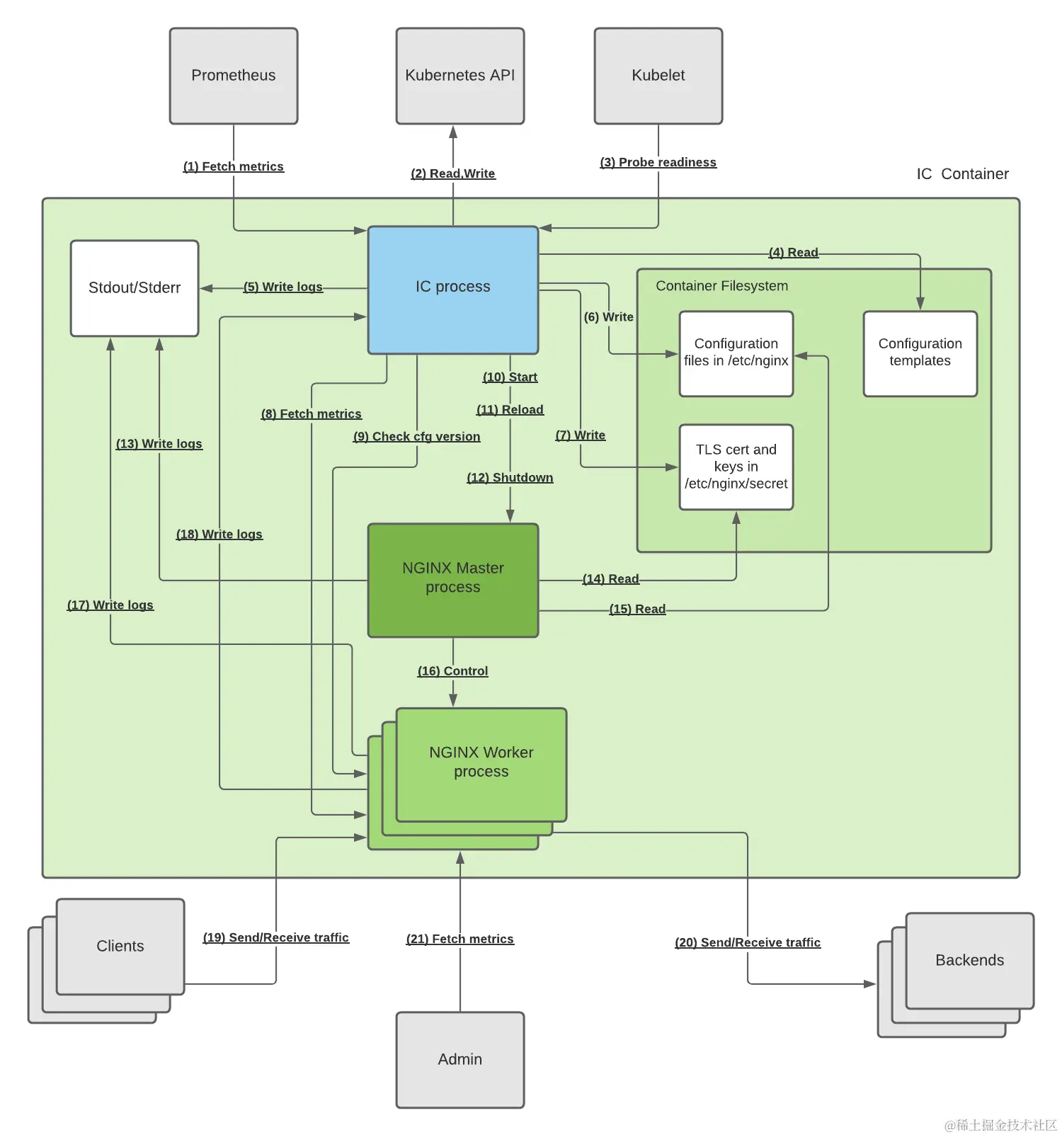 (文件I/O)当IC启动时,它从文件系统中读取配置生成所需的配置模板。模板位于容器的 /etc/nginxtemplate/ 目录中,扩展名为 .tmpl。