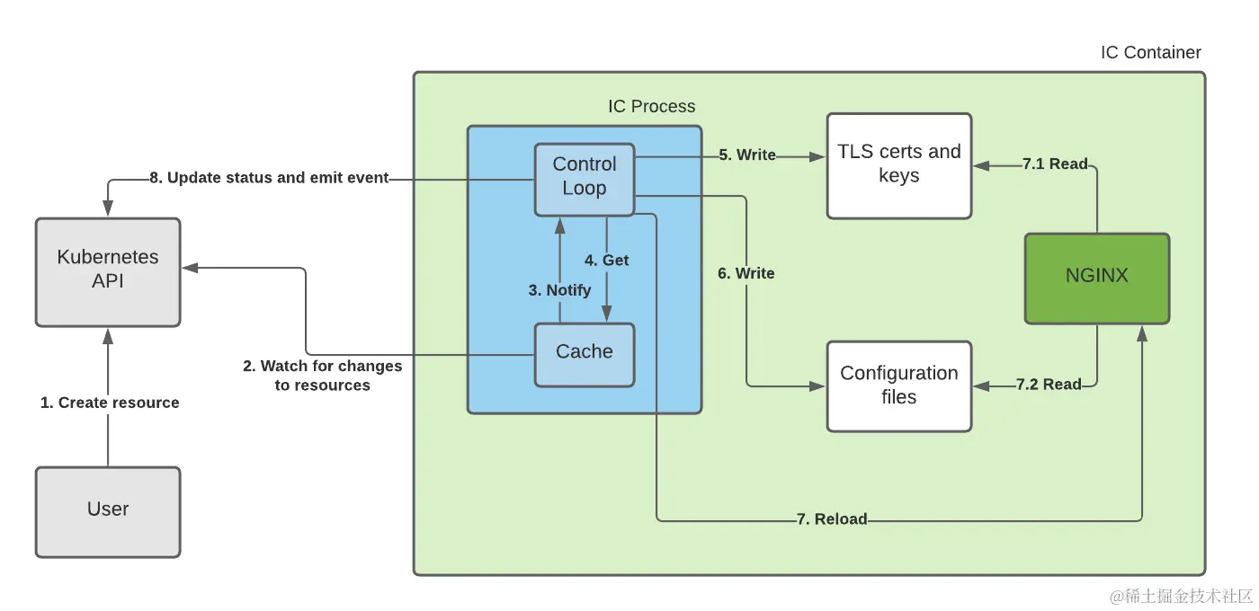 Ingress在部署之后,最重要的任务就是根据集群关键元素的状态生成Nginx的配置文件,然后进行动态管理,如下图所示: