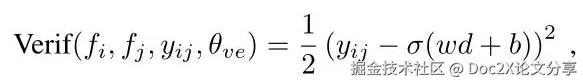其中 和 是从比较中的两个面部图像提取的 DeepID2 向量。 表示 和 来自同一身份。在这种情况下,它最小化两个 DeepID2 向量之间的 L2 距离。 表示不同的身份,而 Eq. 2 要求距离大于一个边际 是在验证损失函数中需要学习的参数。基于 L1 范数的损失函数可以有类似的公式 [16]。在 [18] 中使用了余弦相似度作为