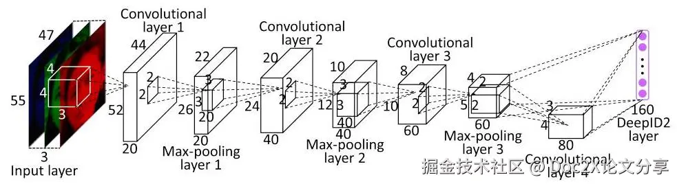 我们使用深度卷积神经网络(深度 ConvNets)[13] 学习特征。深度 ConvNets 中的卷积和池化操作专门设计用于分层提取视觉特征,从局部低级特征到全局高级特征。我们的深度 ConvNets 结构与 [21] 中的相似。它包含四个卷积层,其中前三个层后面跟着最大池化。为了学习多样化的高级特征,我们不要求在更高卷积层的整个特征图上进行权重共享 [10]。具体而言,在我们深度 ConvNets 的第三个卷积层中,神经元权重在每个 局部区域内是局部共享的。在第四个卷积层中,更恰当地称为局部连接层,神经元之间的权重完全不共享。ConvNet 在特征提取级联的最后一层提取一个 160 维的 DeepID2 向量。要学习的 DeepID2 层与第三和第四个卷积层完全连接。由于第四个卷积层提取的全局特征比第三个卷积层更多,DeepID2 层将多尺度特征作为输入,形成所谓的多尺度 ConvNets [19]。我们在卷积层和 DeepID2 层中使用整流线性单元(ReLU)[18]。对于大型训练数据集,ReLU 的拟合能力优于 sigmoid 单元 [12]。用于提取 DeepID2 的 ConvNet 结构示意图如图 1 所示,输入的 RGB 大小为 。当输入区域的大小变化时,后续层中的映射大小将相应变化。DeepID2 提取过程表示为 ,其中 是由 ConvNet 定义的特征提取函数, 是输入人脸补丁, 是提取的 DeepID2 向量, 表示待学习的 ConvNet 参数。