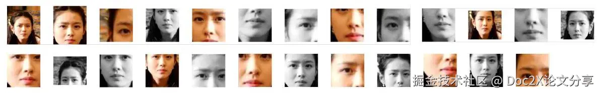 为了减少大量 DeepID2 特征之间的冗余并使我们的系统具有实用性,我们使用前向-后向贪婪算法 [26] 选择少量有效且互补的 DeepID2 向量(在我们的实验中为 25 个),这在测试过程中节省了大部分特征提取时间。图 2 显示了所有选定的 25 个补丁,从中提取了 25 个 160 维 DeepID2 向量,并将它们连接成一个 4000 维的 DeepID2 向量。该 4000 维向量进一步通过 PCA 压缩以进行面部验证。