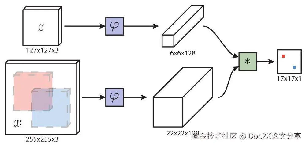 图 1:全卷积孪生网络架构。我们的架构对于搜索图像 是全卷积的。输出是一个标量值的分数图,其维度取决于搜索图像的大小。这使得可以在一次评估中计算搜索图像中所有平移子窗口的相似性函数。在这个示例中,分数图中的红色和蓝色像素包含相应子窗口的相似性。最佳效果请查看彩色图像。
