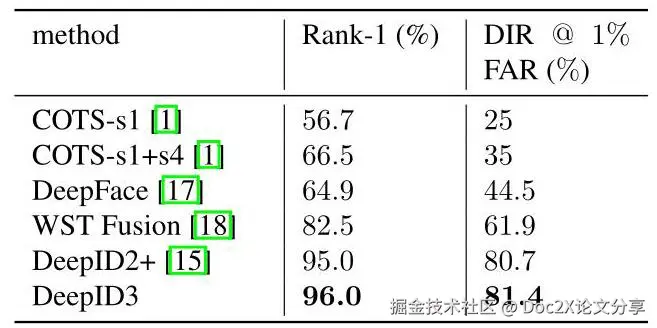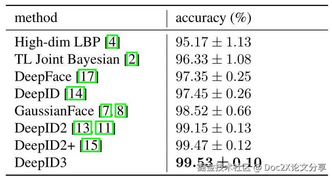 图 4: 在 [15] 中训练的单个 DeepID2+ 和 DeepID3 net 在 LFW 人脸验证上的准确性。