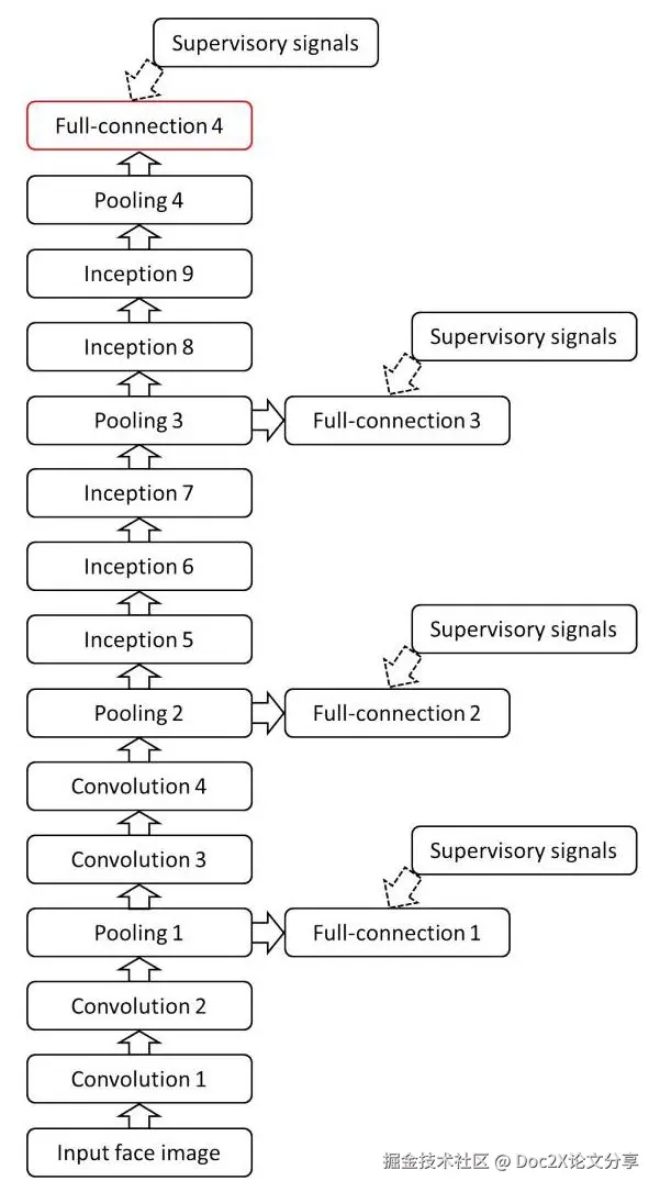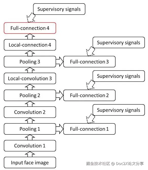图 1:DeepID2+ 网络的架构 [15]。实线箭头表示前向传播方向。虚线箭头指向添加了联合人脸识别-验证监督信号的层。红框中的最终特征提取层用于人脸识别。