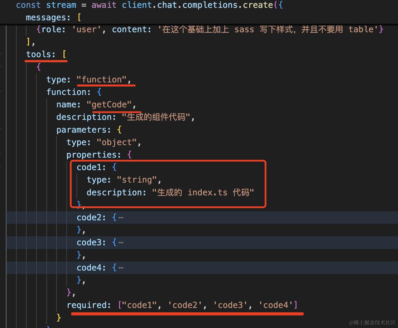 提取回答中的代码,主流的方案是正则匹配,但我们今天用了 tools 的方式来提取的代码,它是让 AI 的回答是按照函数调用的方式,生成某种格式的参数。我们再解析参数 json 就可以了。