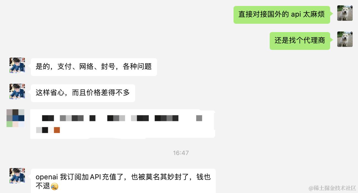 我们通过 openai 的 npm 包来调,找一个国内代理商的 API_KEY 就可以了。