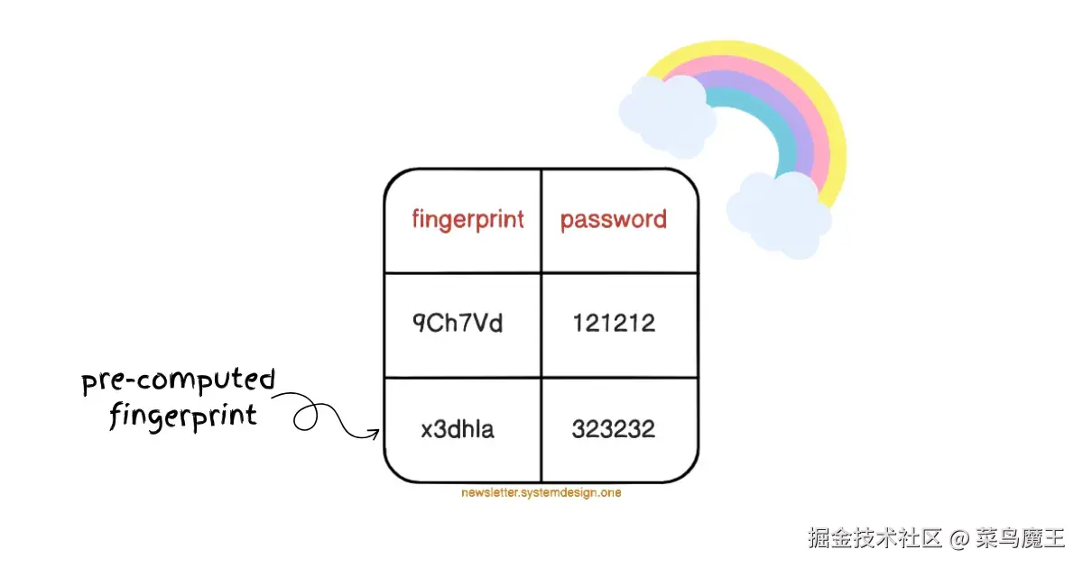 可以将彩虹表视为一个预先计算好的指纹与密码之间的映射表。