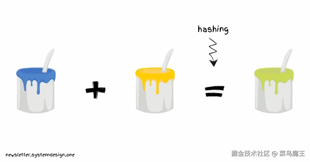 可以将哈希函数比作颜料混合的过程 —— 一旦两种颜色混合,就很难再分离出原始的颜色。