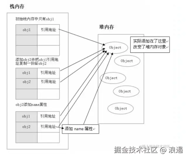 - 而对象类型的变量则同时会分配栈内存和堆内存,其中栈内存存放的是地址,堆内存存放的是引用类型的值。 可以参考下面的图来形象了解下 !