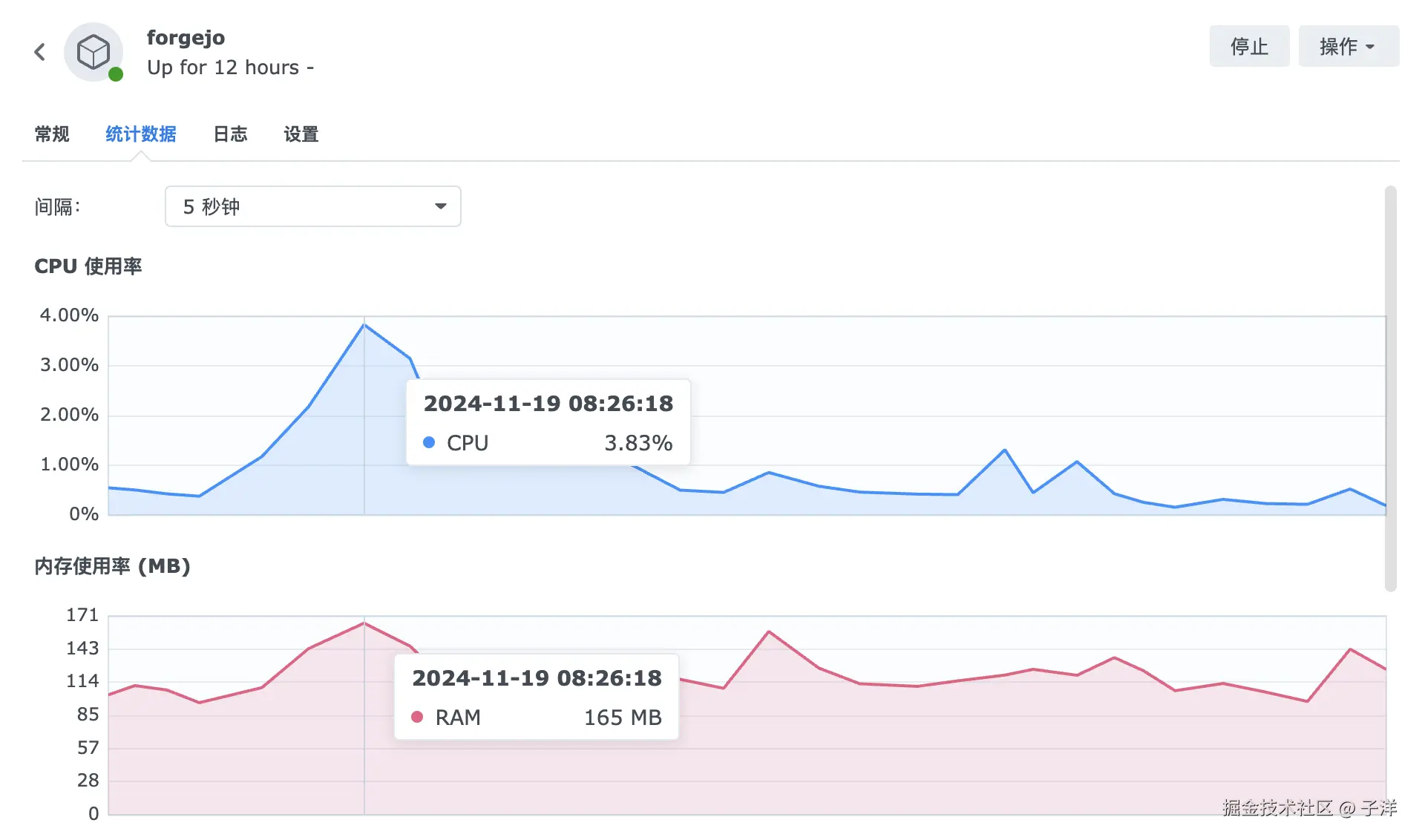 forgejo 内存使用率最高才 165MB, CPU 使用率也仅有 3.83%, 于 GitLab 完全不是一个量级。