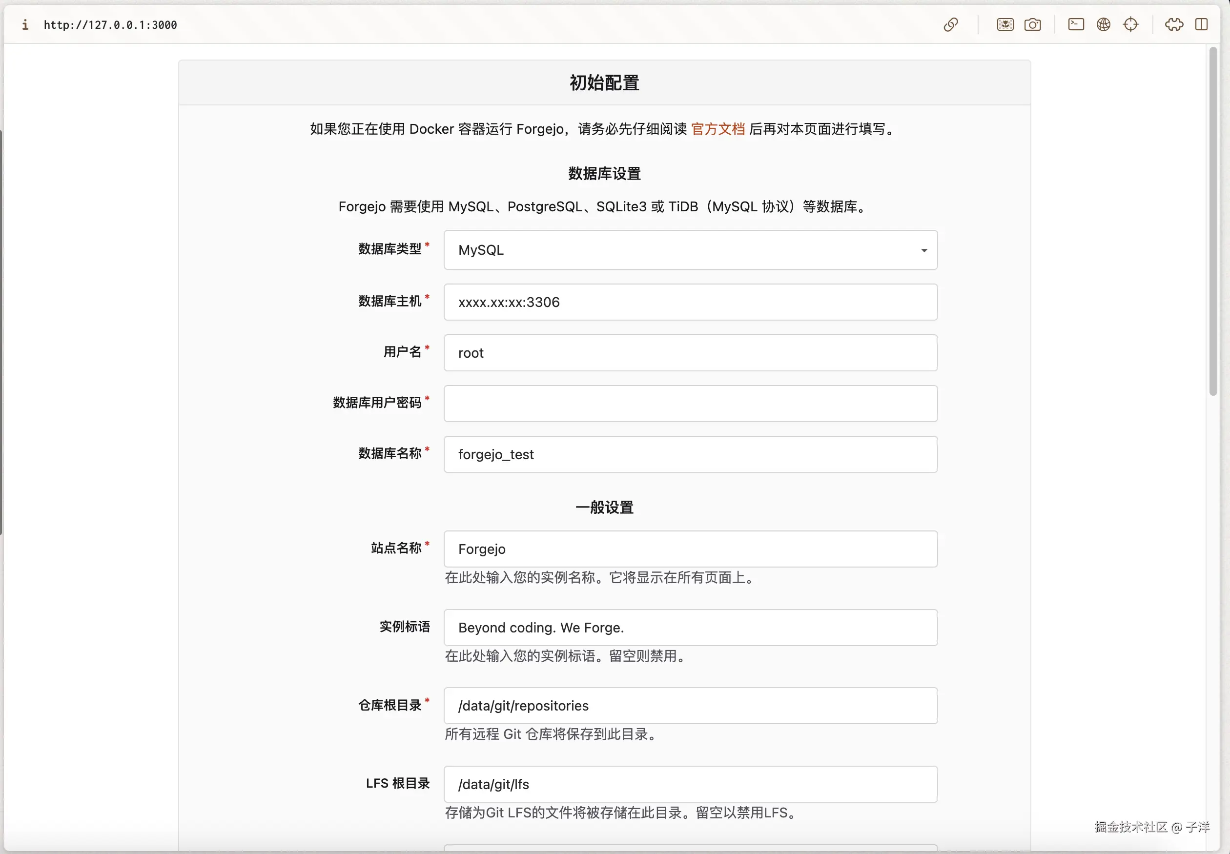 服务启动后访问 127.0.0.1:3000,就会看到 Forgejo 系统的配置页面。在这儿,我们可以根据自己的需求改一改设置。要是有些地方不太确定咋设置,也没关系,等安装完了,还能通过修改 app.ini 配置文件来调整。