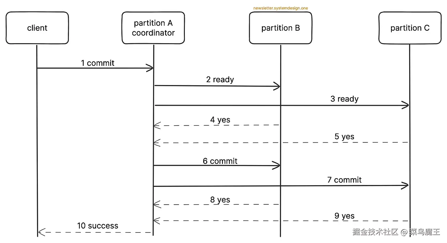 提交阶段:若所有分区均同意,协调者(coordinator)将指示它们进行提交。