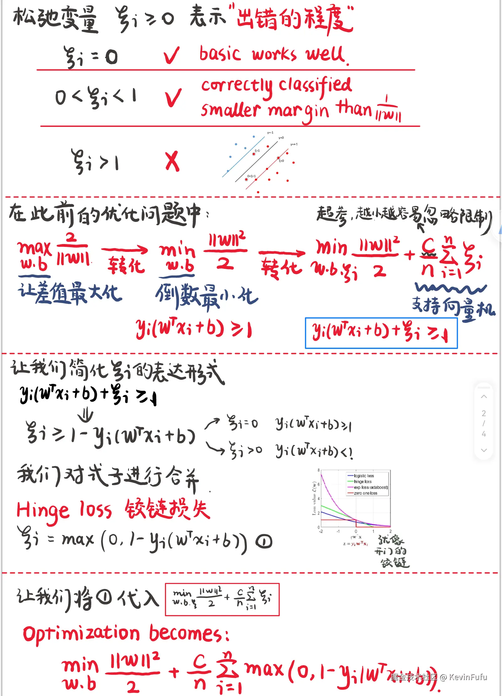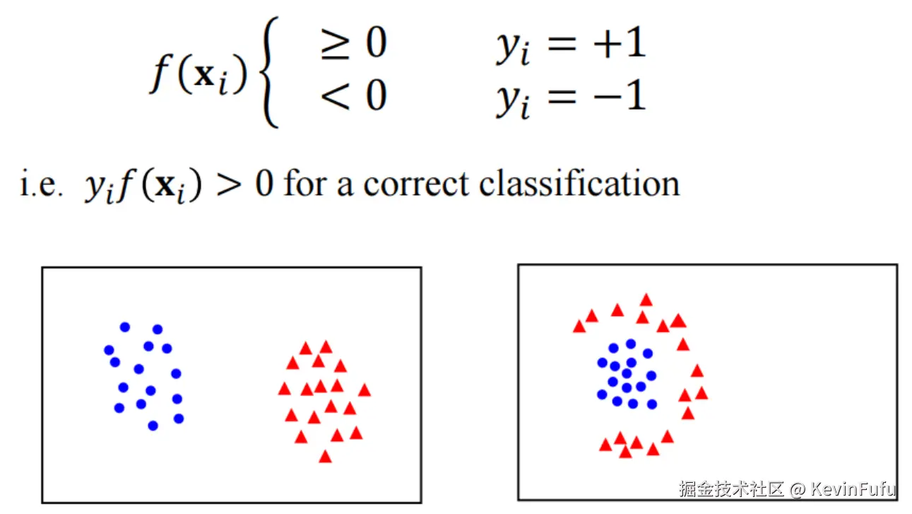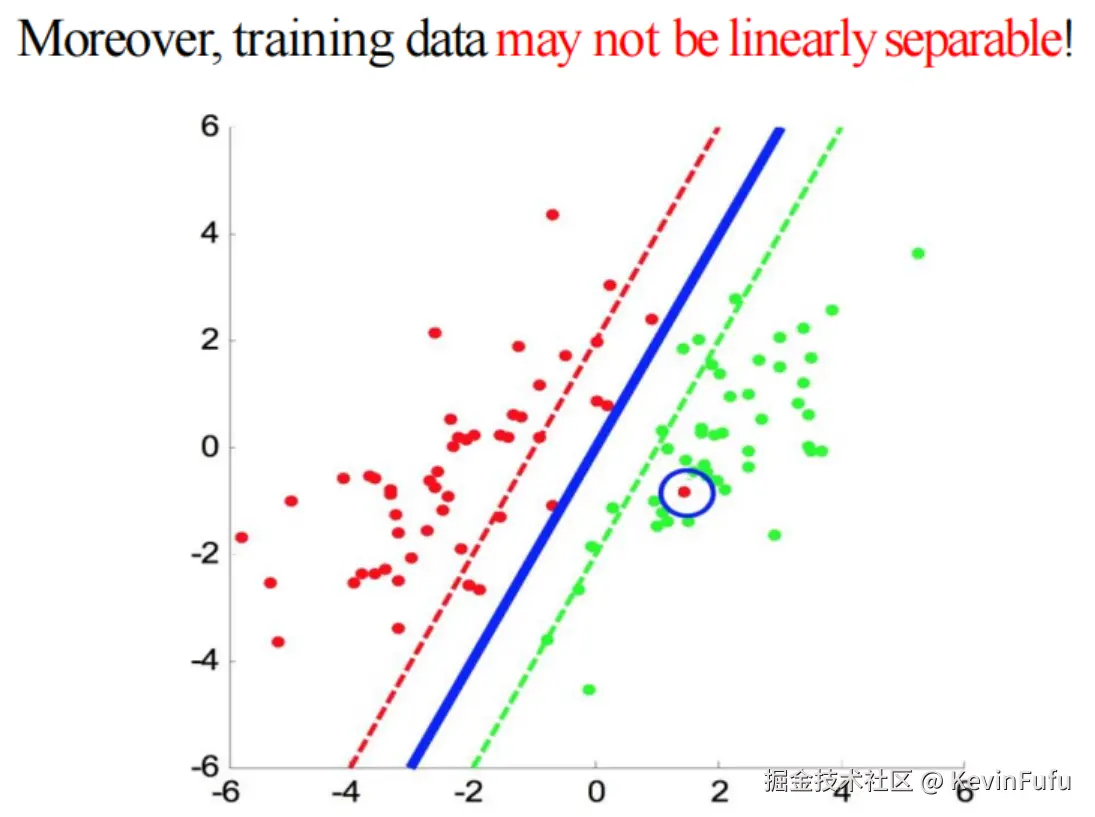以上的推导的基础是理想情况,但是真实的情况可能会出现疏漏等情况。所以开发者需要在寻找最优 margin 和平衡训练数据的潜在错误中去追求一种平衡状态。况且,在这种特殊情况,训练数据甚至可能无法实现线性可分割!
