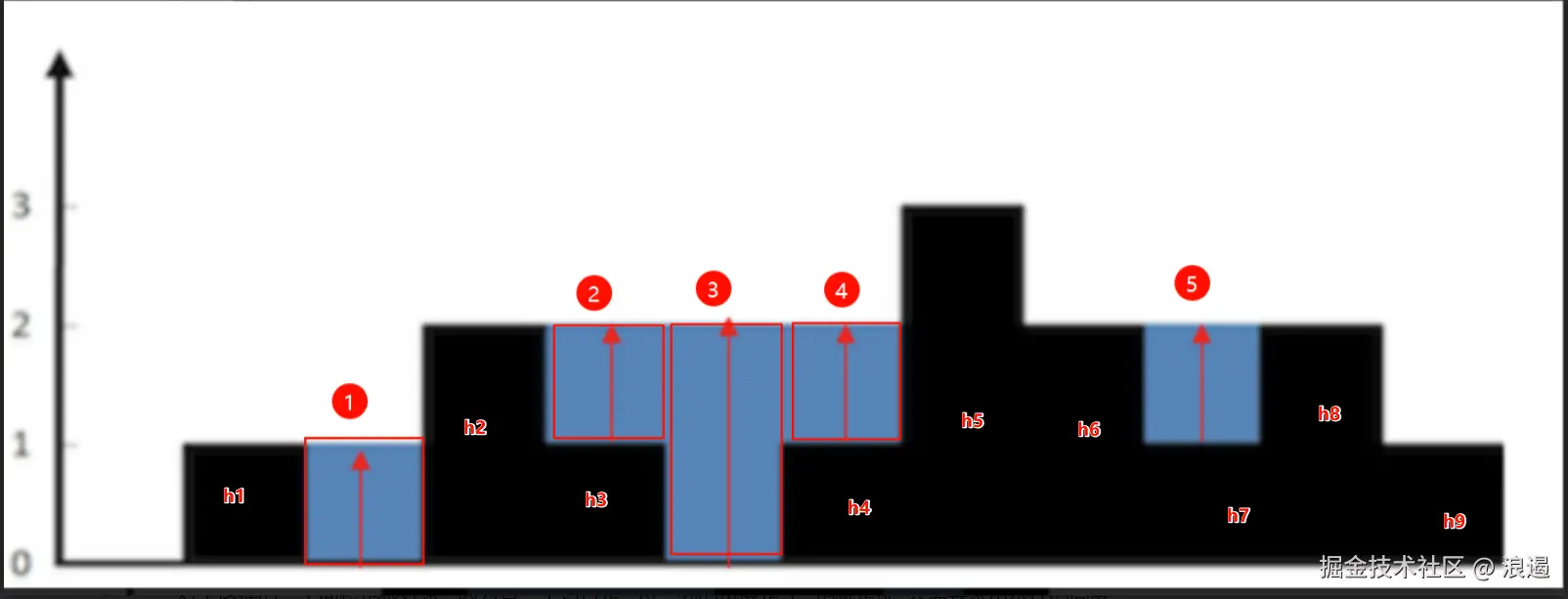 看水柱 2 ,他的高度取决于左边最高 h2 , 右边最高 h5 , 按水柱 1 的想法来就是取决于 h2 (h2<h5) , 然而不要忘记 h3 的高度要减去 , 所以到这里就可以推出: 水柱高度取决于当前要求的水柱位置 , 他左边黑柱子最高高度 ,与他右边黑柱子最高高度 , 还有当前位置黑柱子的高度 !