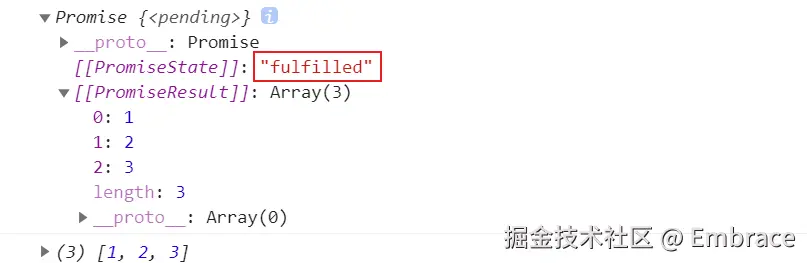通过上面的案例,可以在浏览器中查看Promise分别在执行resolve和reject后的打印结果和Promise当时处于的状态: