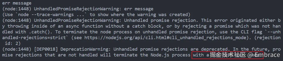 const p = new Promise((resolve, reject) => { reject('err message') }) p.then(res => { console.log(res) }) p.catch(err => { console.log(err) }) -